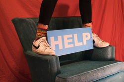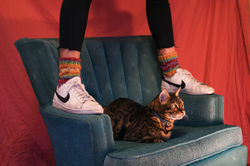 This set of images was created as an experiment of how the cat would react to different movements. The chair and sign were found objects and the socks that fit this color scheme were hand knitted by me.