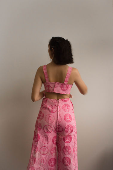 Part 1 is two layers of screen printing on both paper and fabric, choosing to print the solid color to keep the colors of the wallpaper and the outfit the same.
