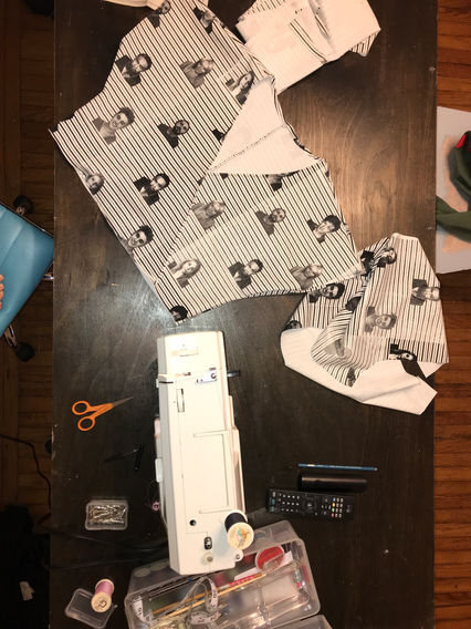 This is a jumpsuit that was hand screenprinted using a repeat pattern consisting of lines that replicate the size marks that would be placed behind someones head as they were getting their mugshot taken, as well as multiple mugshots of childhood stars. This piece is meant to call attention to the damage that can be caused by fame and fortune at a young age, and how society rarely sees an issue with how fast child stars are forced to grow up, and often forced to give up their childhoods as a whole.